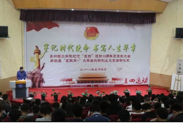 (理学院统计174班 熊鑫 报道)五四精神传承不朽,历史的使命引领着我们新时代青年走向了积极向上、努力拼搏时代征途。2018年5月4日下午14:00,贵州理工学院纪念五四运动99周年暨表彰大会以及第四届“互联网+”大学生创新创业大赛启动仪式在逸夫小报告厅举行,此次会议由贵州理工学院校团委书记李朋书记主持。
