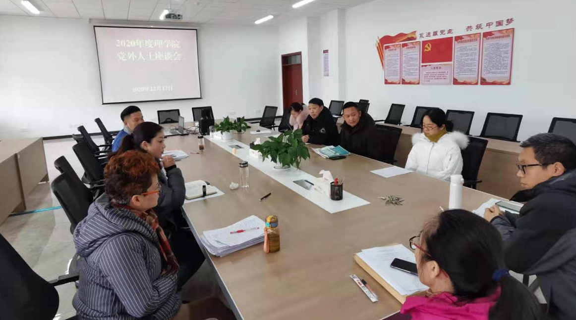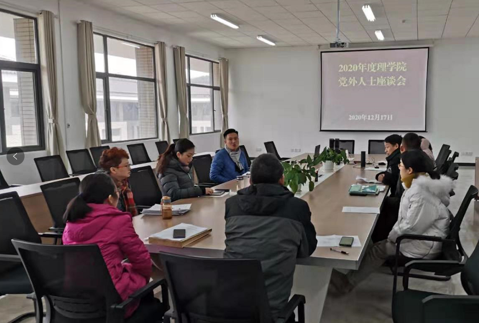 袁小松 报道)12月17日下午,理学院党总支组织召开2020年度党外人士座谈会,理学院民主党派、无党派教师肖志俊、周靖楠、朱洁、宋家彬等8位教师参加座谈会。座谈会由理学院党总支书记袁小松主持,党总支副书记蒙蔺参加座谈。