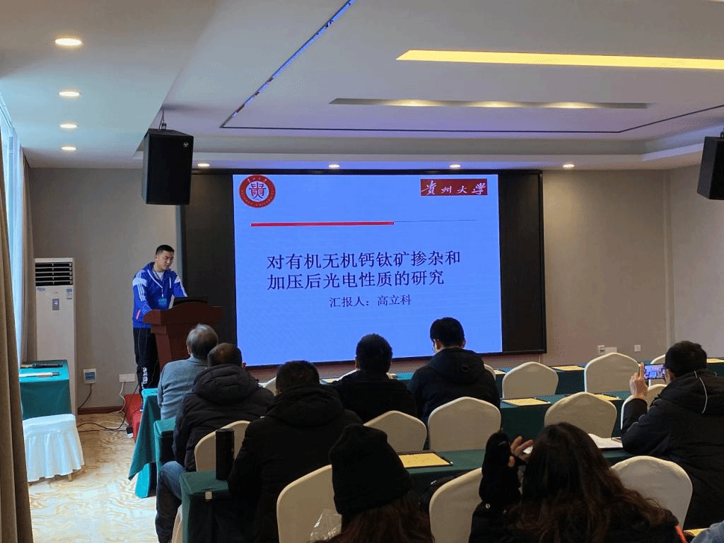 12月19日下午在第一分会场,我院物理教研室高立科博士就“对有机无机钙钛矿掺杂和加压后光电性质的研究”做了分组报告,介绍了钙钛矿的特性以及在清洁能源的应用前景,并与参会人员展开交流讨论。