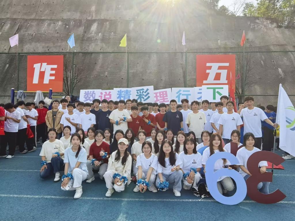 运动会开幕式上,理院学子们身着设计服装,喊着口号,以创意表演展现活力,动作整齐,手持数学符号模型,体现理学院的严谨精神的。