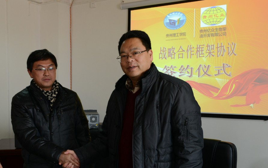 1月6日下午3:00,“贵州理工学院 贵州亿众生物柴油开发有限公司战略合作框架协议签约仪式”在马列主义教学部会议室举行,校党委书记曾羽、副校长王建平,贵州亿众公司董事长李泽江、总经理蒋锋等人出席仪式。