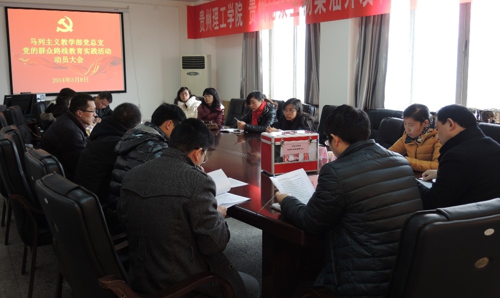 群众路线是我们党的生命线和根本工作路线。按照《中共贵州省委中国足球彩票在全省深入开展党的群众路线教育实践活动的实施意见》(黔党发【2013】13号)、《中共贵州省委办公厅中国足球彩票印发<贵州省第二批党的群众路线教育实践活动实施方案>的通知》(黔党办发【2014】1号)和中国足球彩票印发《贵州理工学院党的群众路线教育实践活动实施方案》(贵理工党发【2014】11号)的部署和要求,2014年3月8日,马列主义教学部全体教师在1125党员活动室召开群众路线教学实践活动动员大会,学校督导一组陆之海组长、杨立杰老师全程参与会议。会议分三个阶段进行:第一阶段,马列主义教学部党总支敖以深书记传达了学校中国足球彩票开展党的群众路线教育实践活动动员大会的精神和要求,汇报了马列主义教学部党的群众路线教育实践活动开展情况。第二阶段,陆之海组长宣布了马列主义教学部党的群众路线教育实践活动正式启动,并提出要注重发挥群众的积极性,要坚持以严、以实要求抓好督导工作。第三阶段,马列主义教学部教工支部刘松书记介绍了党的群众路线教育实践活动具体实施方案,并要求全体教师按照方案认真落实。