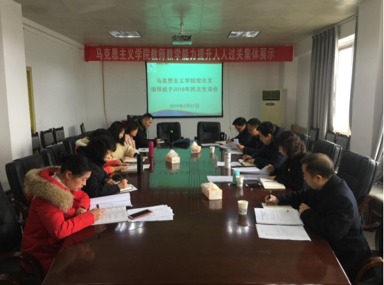 会上,马克思主义学院党总支负责人通报了2017年度民主生活会整改措施落实情况和2018年民主生活会征求意见情况,进行了班子对照检查,并带头作自我批评,其他班子成员依次逐一进行个人对照检查发言,相互提出批评意见。大家运用批评和自我批评武器,坦诚相见、直言不讳,自我批评严肃认真、不遮不掩,相互批评一针见血,进一步增强了党性观念,坚定了理想信念,达到了预期目的。