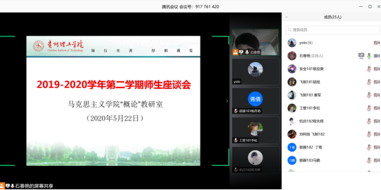 (本网讯 马克思主义学院 李娜、刘应、杨立杰/图文)5月22日,马克思主义学院采用腾讯视频会议方式召开了2019-2020学年第二学期师生座谈会,讨论总结新冠肺炎疫情期间线上教学的经验和不足,常务副院长敖以深、副院长欧阳德君、全体任课教师及部分学生代表参加此次座谈会。