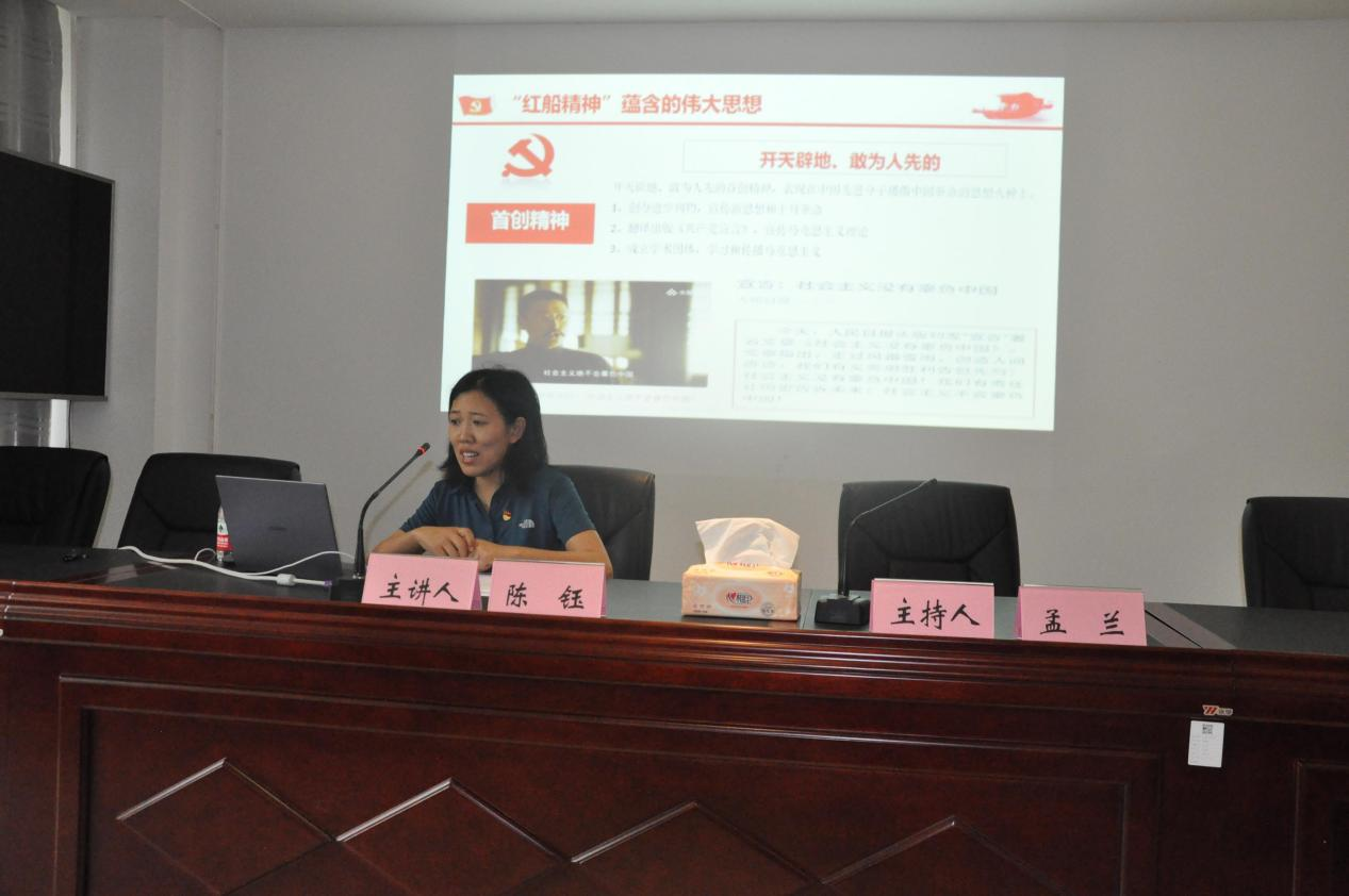 本次联合主题党日活动分为三个阶段进行。首先贵州理工学院马克思主义学院陈钰老师开展《红船精神》专题党课,她从“红船精神”蕴含的伟大思想、“红船精神”蕴含的时代价值以及“红船精神”与中国共产党人的初心和使命三个方面给在场所有党员上了一堂生动的党史课。