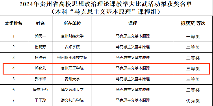 近日,2024年贵州省高校思想政治理论课教学大比武活动评选结果揭晓,马克思主义学院郭勤艺老师获本科“马克思主义基本原理”课程组三等奖,聂祥乙老师获“形势与政策”讲道理组三等奖。