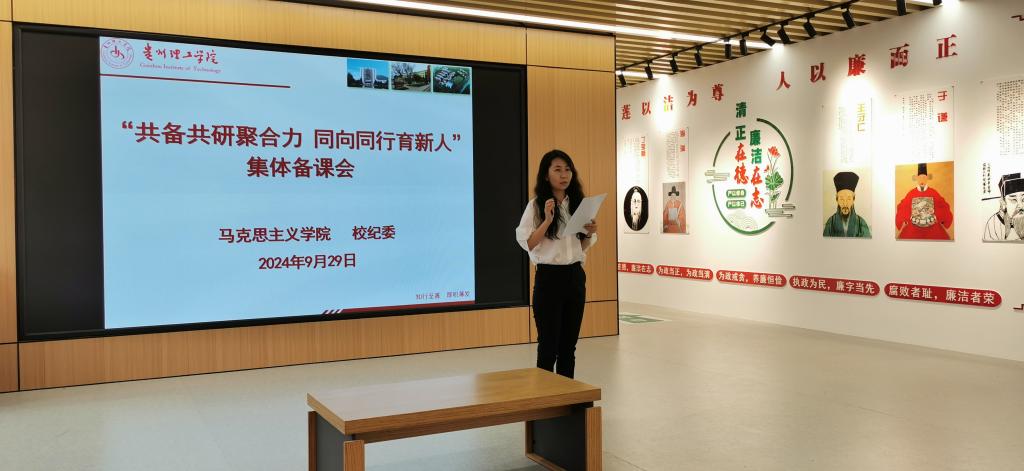 本网讯(马克思主义学院 吴园园/文 张建军/图)9月29日,在校纪委的指导下,马克思主义学院开展党的二十届三中全会精神融入高校思政课教学集体备课会,积极探索“青廉课堂”建设新思路,持续推进“清廉理工”品牌建设,全体思政课教师和校纪委干部参会。