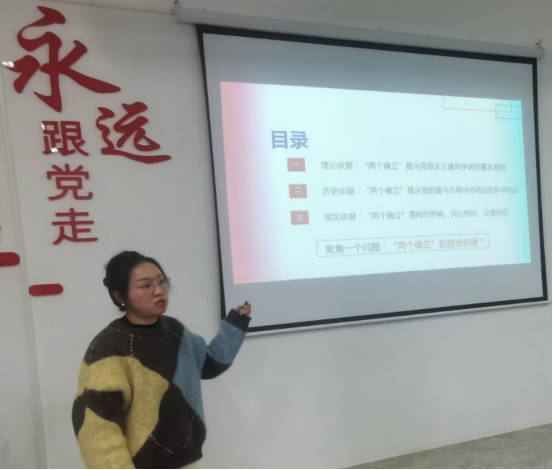 李娜老师围绕“两个确立”形成的理论依据、历史依据、现实依据三个角度出发,对深刻领悟“两个确立”的决定性意义进行阐释。