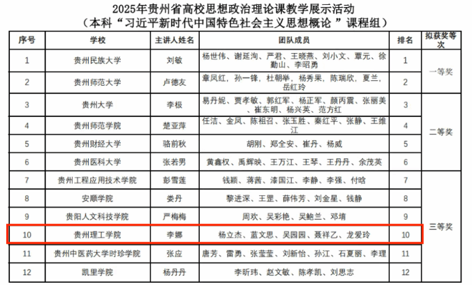 本网讯(马克思主义学院 吴园园/文、图)近日,第四届全国高校思政课教学展示活动贵州省初赛获奖结果公示,我院聂祥乙老师及其教学团队荣获本科组《形势与政策》课程组一等奖,被推荐参加全国高校思政课教学展示活动。《习近平新时代中国特色社会主义思想概论》《毛泽东思想和中国特色社会主义理论体系概论》《马克思主义基本原理》分别荣获三等奖。