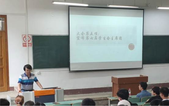 本次换届大会在卢缨老师的主持下拉开序幕。首先,卢缨老师向同学们展示了2019——2020学年学生会影集,之后第六届学生会主席团代表成前对学生会全体成员过去一年的工作进行了总结,也指出了学生会工作的一些不足之处,同时也表示对新一届学生会干部寄予厚望。