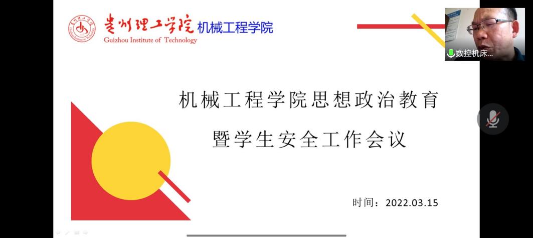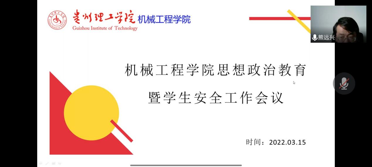 2022年3月15日,机械工程学院组织召开思想政治教育暨学生安全工作视频会议,会议由学院党总支书记熊远兴主持,院长周知进出席会议,全体辅导员和班主任参加会议。