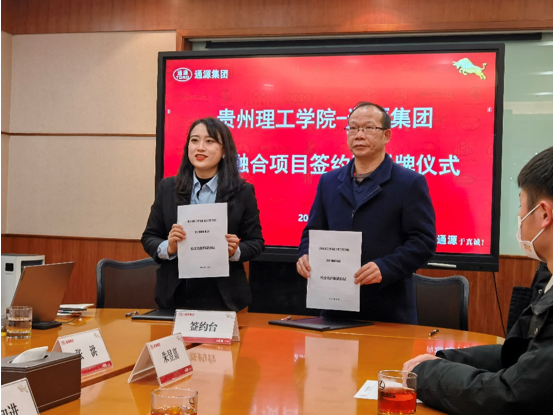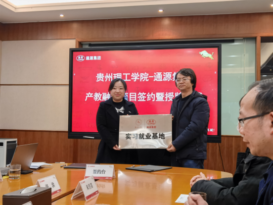 党总支书记熊远兴与集团人事部部长赵静为“贵州理工学院机械工程学院—通源集团实习就业基地”揭牌,院长周知进与集团签署实习基地合作协议。