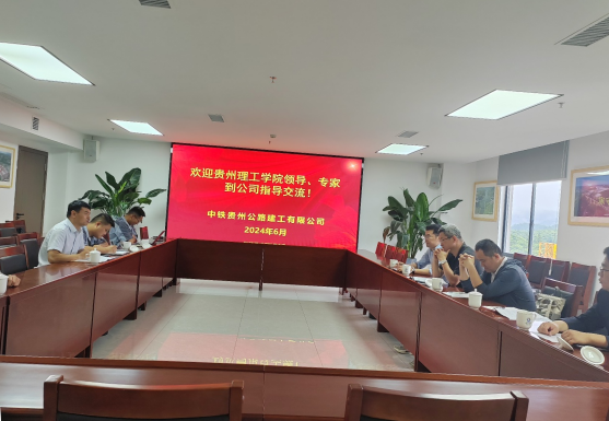 在中铁贵州公路建工有限公司,校企双方座谈,座谈会就双方校企合作、科研合作和学生实习就业等几方面进行开展,主要围绕公司技术人才需求和工程中的某些技术问题进行交流讨论。中铁贵州公路建工有限公司总工程师周辉辉和中铁贵州公路建工有限公司技术中心副部长蒋忠良参加座谈。座谈会后参观了生产现场。