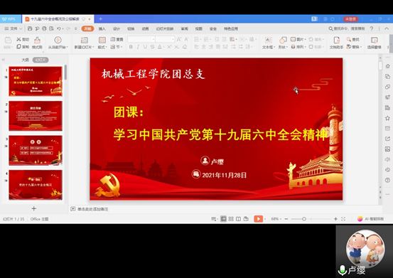 2021年11月28日,机械工程学院团总支召开党的十九届六中全会精神专题团课宣讲会,此次宣讲会以腾讯会议的形式召开,由团总支书记卢缨主持,学院团总支全体团学干部及第十七期团校培训班学员参加。