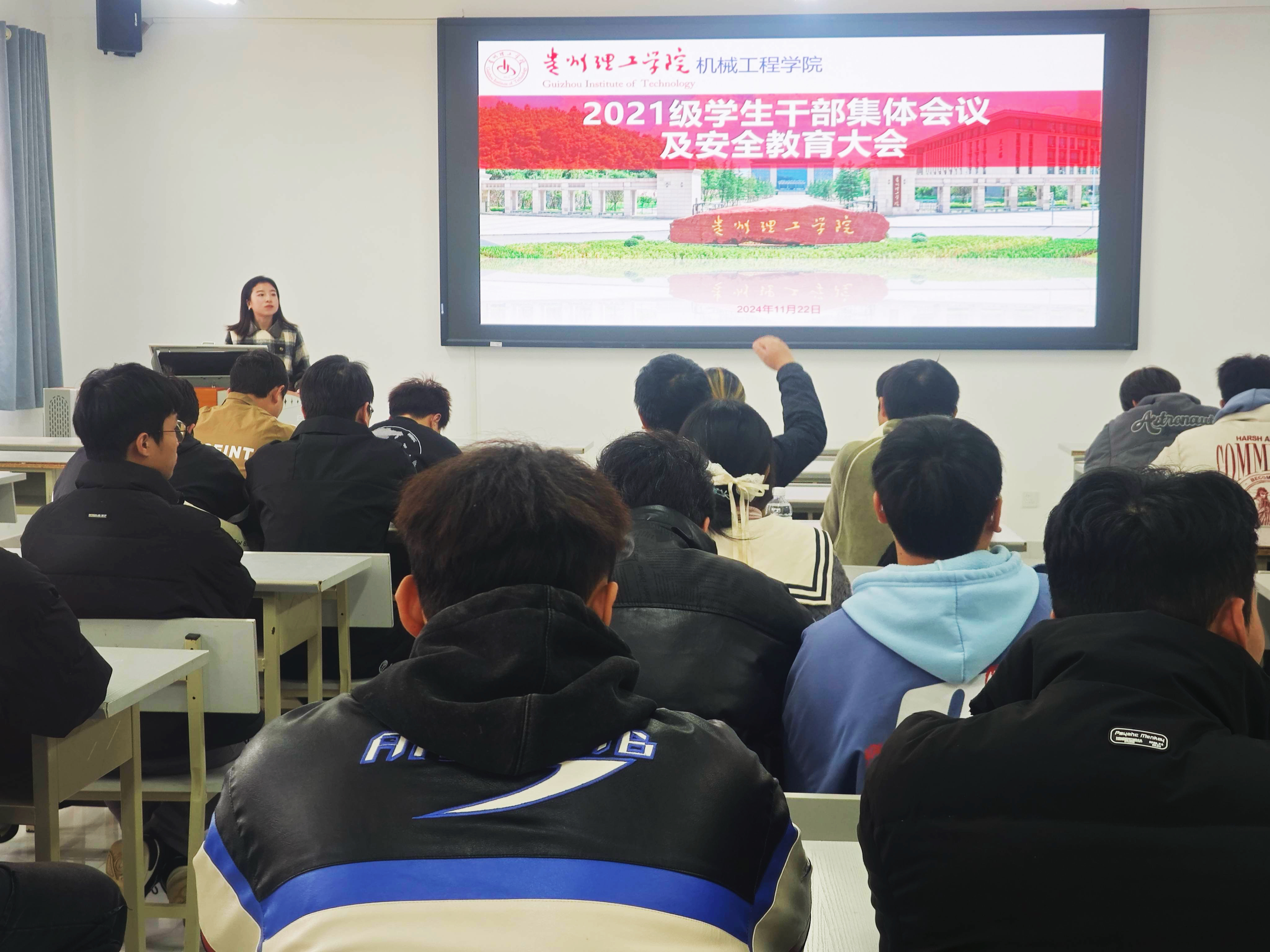 2024年 11 月20日,机械工程学院于致知楼召开各年级学生干部集体会议,旨在全面提升学生干部工作水平与思想觉悟,进一步加强学生干部队伍建设。会议由辅导员罗曼老师和辅导员陈茂老师分别主持,相应年级全体学生干部参会。