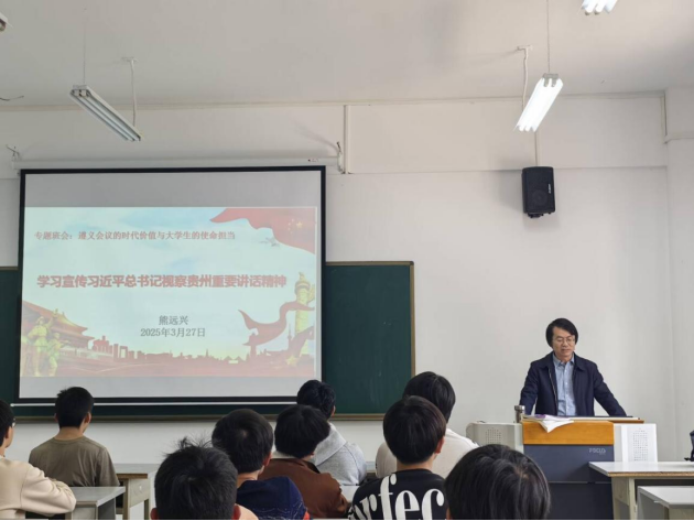熊远兴与同学们一道学习了习近平总书记视察贵州的重要讲话精神,紧扣“遵义会议的时代价值与大学生的使命担当”主题,讲述了遵义会议召开的历史意义,分析了遵义会议精神的深邃内涵和时代价值。熊远兴指出,当代大学生理应从遵义会议精神中深挖力量,传承红色基因,坚定理想信念;努力掌握专业知识,提高综合素质,培养创新精神和实践能力;刻苦学习,勇于担当,为实现中华民族伟大复兴贡献力量。
