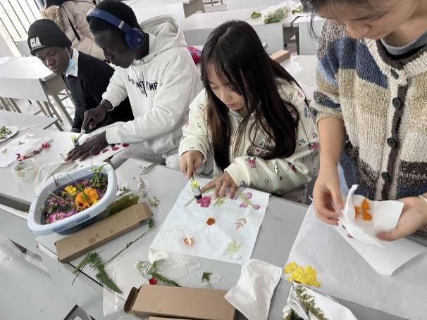步入干花团扇制作区中,“花叶凝香入素纨,轻摇便是墨清风”的雅致意境扑面而来,同学们充分发挥想象力与创造力,将精心准备的干花材料,通过巧手粘贴、组合,细心点缀在素白的团扇扇面上。原本朴素的团扇瞬间被赋予新的生命,自然之美的永恒与古典扇具的韵味相得益彰,摇曳出缕缕古风今韵。