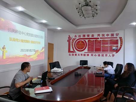 本网讯(评估中心 夏黄晶/文 刘平/图)根据学校要求,机关评估中心党支部于2021年9月27日14:30在喀斯特二楼会议室开展“弘扬伟大建党精神,做新时代先锋”主题党日活动。活动由党支部书记邵芳同志主持,评估中心在岗全体人员参加。