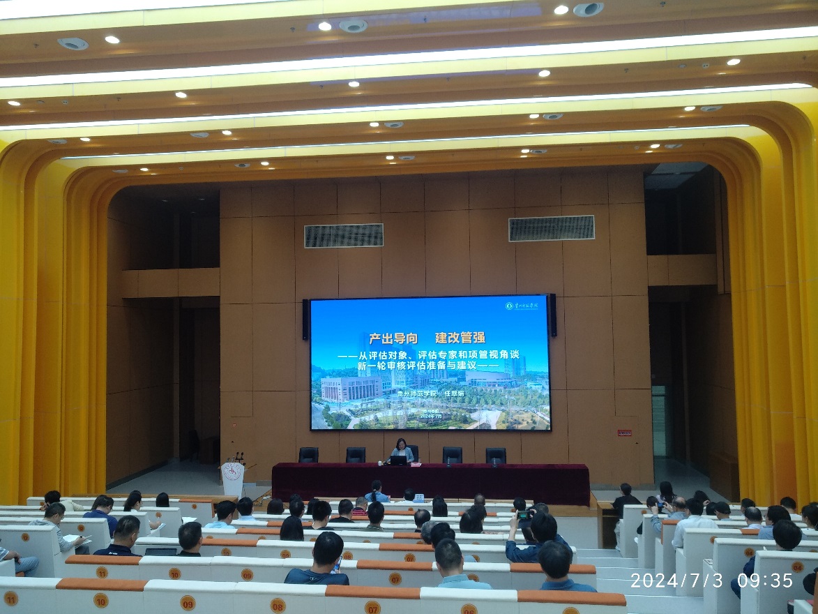 本网讯(图/文 夏黄晶)为学习本科教育教学审核评估建设工作的宝贵经验、先进理念,学校本科教育教学审核评估评建办公室(简称评建办)于2024年7月3日上午在图书馆报告厅组织召开本科教育教学审核评估专家专题辅导会。评建办邀请贵州师范学院生物科学学院院长任翠娟教授作《产出导向,建改管强——从评估对象、评估专家和项管视角谈新一轮审核评估准备与建议》的专题辅导报告。校领导潘良明、安艳玲出席会议,各职能部门负责同志,各学院(中心)党总支书记、院长、教学院长,评建办全体副主任及成员,校督导组组长,教务处班子成员及各科室负责人,教学质量评估监控中心全体人员参会。