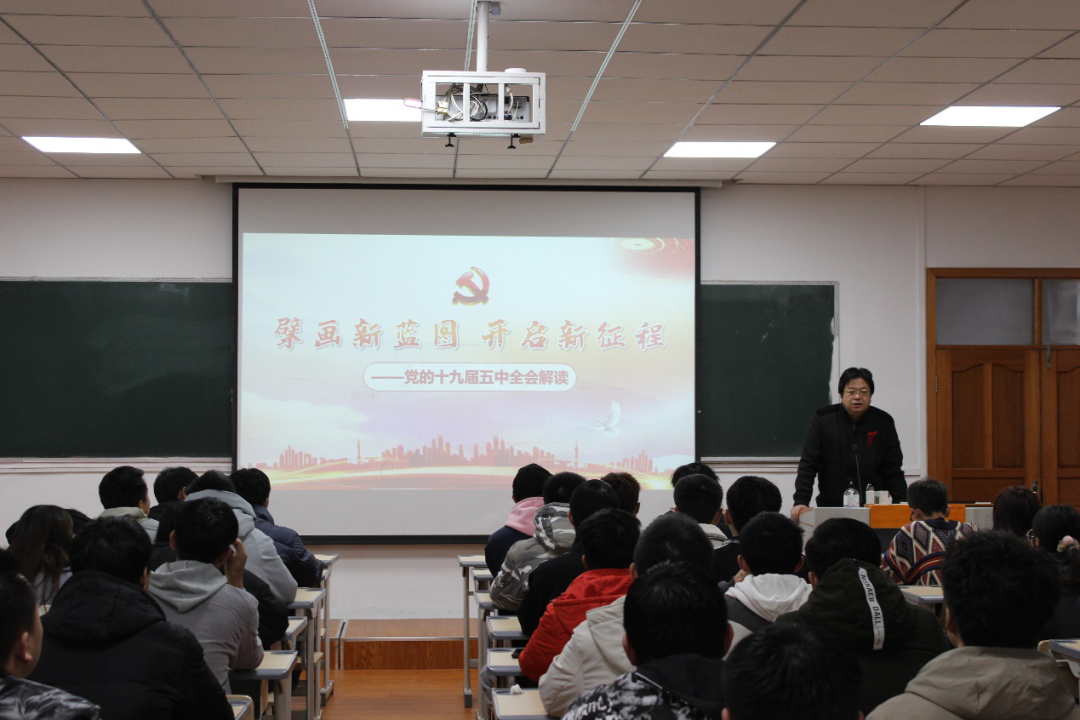 苏向东结合资源与环境工程学院专业特点,为学生们重点解读了党的十九届五中全会的深刻内涵、具体要求。从第一个五年规划到改革开放以来我国取得的伟大成就,再到2035远景目标,精彩的讲述让同学们深刻了解了十九届五中全会的重大意义。他与大家分享了许多鲜活的案例,勉励大家刻苦学习,勇于实践,敢于创新。课堂上,同学们积极参与互动,气氛轻快、活跃。
