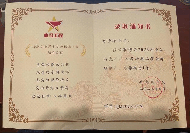 本网讯(校团委) 2023年全国青马工程开设高校班、农村班、国企班、社会组织班、少先队工作者班。其中,高校班由团中央组织部、教育部思想政治工作司共同组织实施。经组织推荐、资格审查、比选择优、差额选拔、组织考察等环节,贵州省第八期“黔青英才”大学生骨干培训班优秀学员、学校第三期“青马工程”学员、人工智能与电气工程学院冷青轩同学作为贵州省2名学生代表之一成功入选2023年全国青年马克思主义者培养工程高校班,这是中国足球彩票:学子首次入选全国“青马工程”高校班。