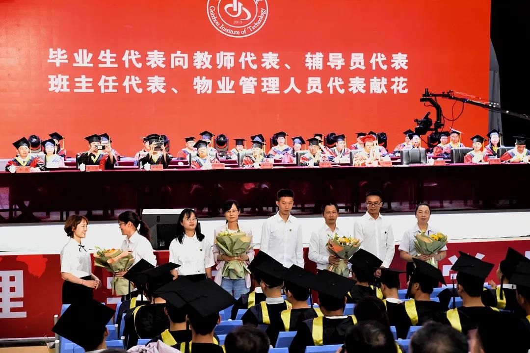 毕业生代表向教师代表、辅导员代表、班主任代表、物业管理人员代表献花。