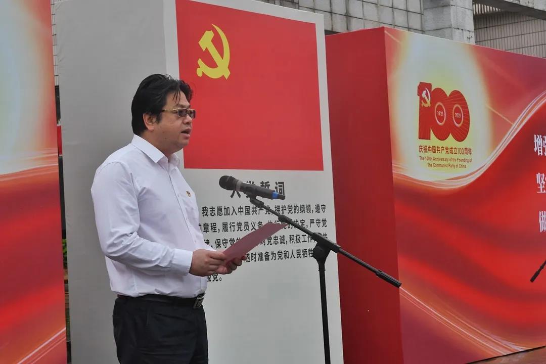 仪式在嘹亮的国歌声中拉开了序幕。面对鲜艳的党旗,党委书记曾羽带领全体党员举起右拳庄严宣誓:“我志愿加入中国共产党,拥护党的纲领,遵守党的章程,履行党员义务,执行党的决定,严守党的纪律,保守党的秘密,对党忠诚,积极工作,为共产主义奋斗终身,随时准备为党和人民牺牲一切,永不叛党。”