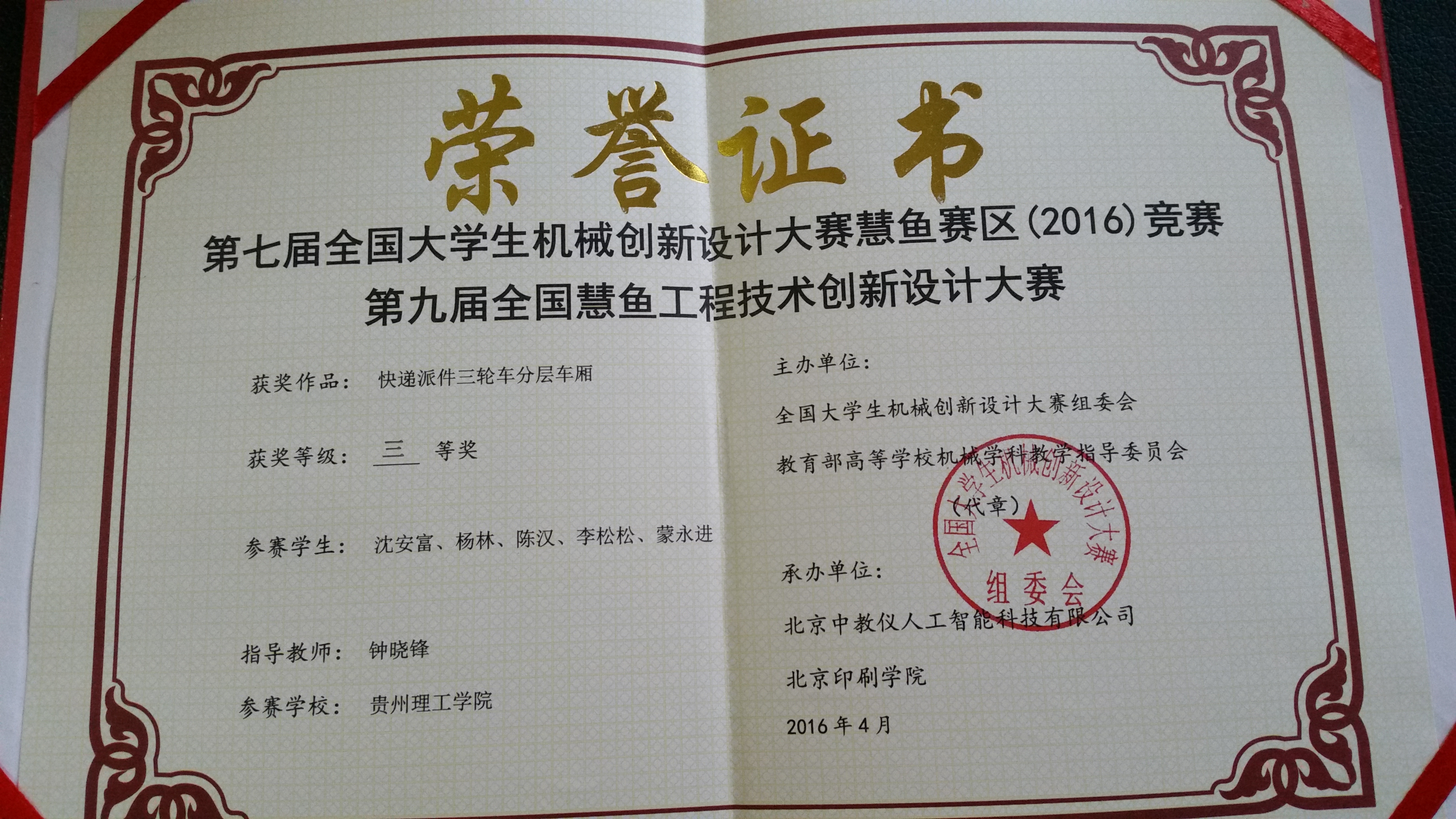 本次比赛,中国足球彩票:参加决赛。在钟晓锋老师的指导下,经过长时间的精心准备,沈安富等同学设计制作的“快递派件三轮车分层车厢”与其他高校在北京印刷学院同台竞赛。该作品以其独特的结构设计得到了专家们的青睐,获得了全国三等奖的优异成绩。