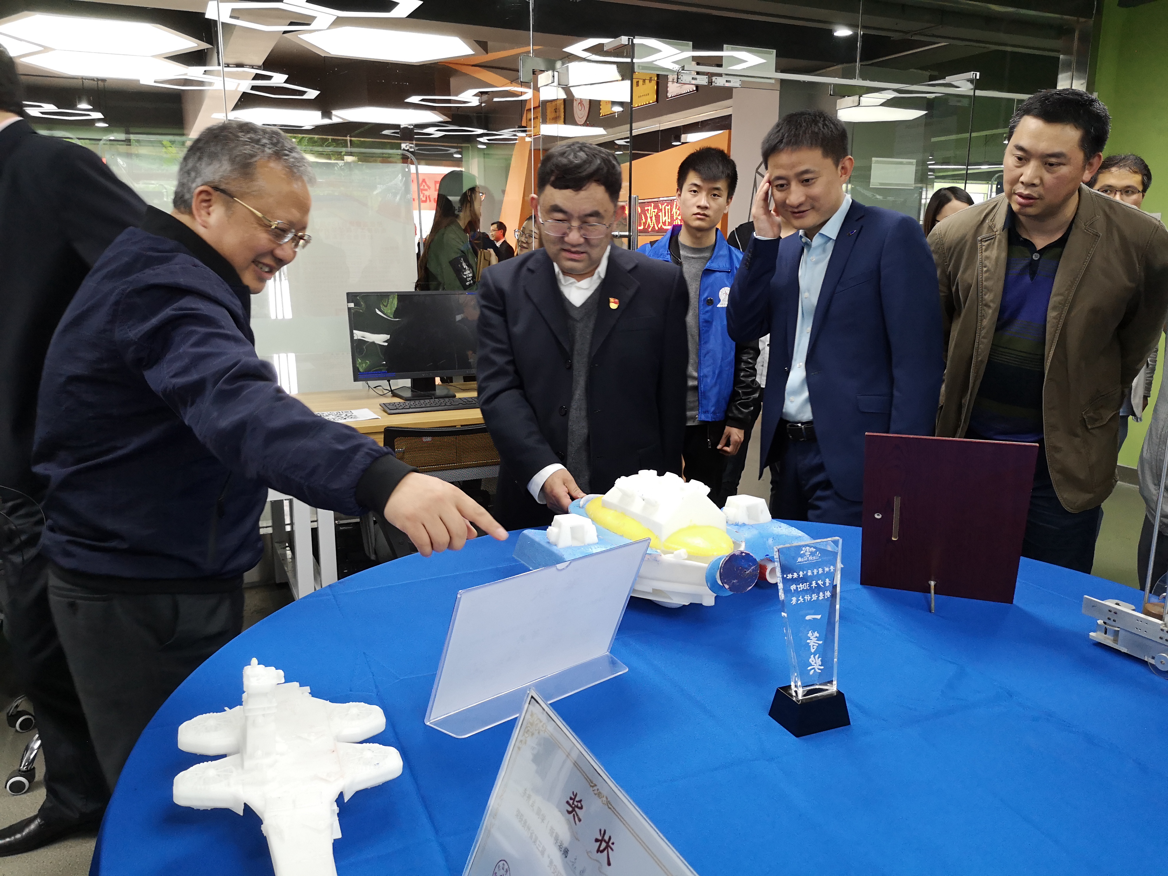 2019年5月9日,“纪念五四运动100周年”贵州理工学院首届大学生创新创业成果展开幕式暨“互联网+”创新创业大赛“青年红色筑梦之旅”启动仪式在创新创业中心开展。工程训练中心(以下简称中心)3D打印创新实验室作为本次成果展的重要展点,集中展出了一批中心教师近年来指导学生获得的创新创业成果奖项和作品。中心展出的作品受到学校领导、各学院教师和学生的广泛关注,校领导亲临展台并仔细观摩学生作品,在肯定学生作品的同时,也指出了作品的一些不足之处,为中心教师指导学生创新创业提出了宝贵的建议。展览当天,来自学校不同专业的部分同学积极与中心教师交流,展览获得了圆满成功。