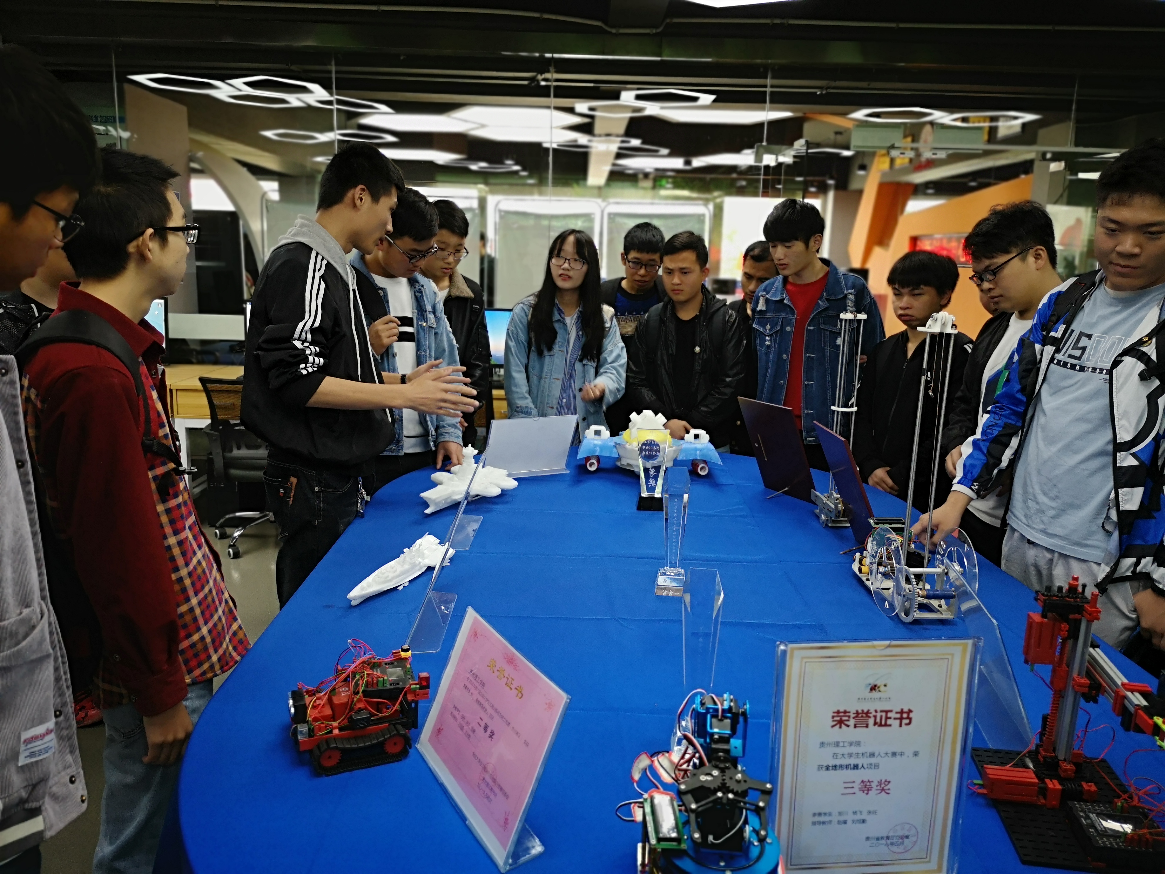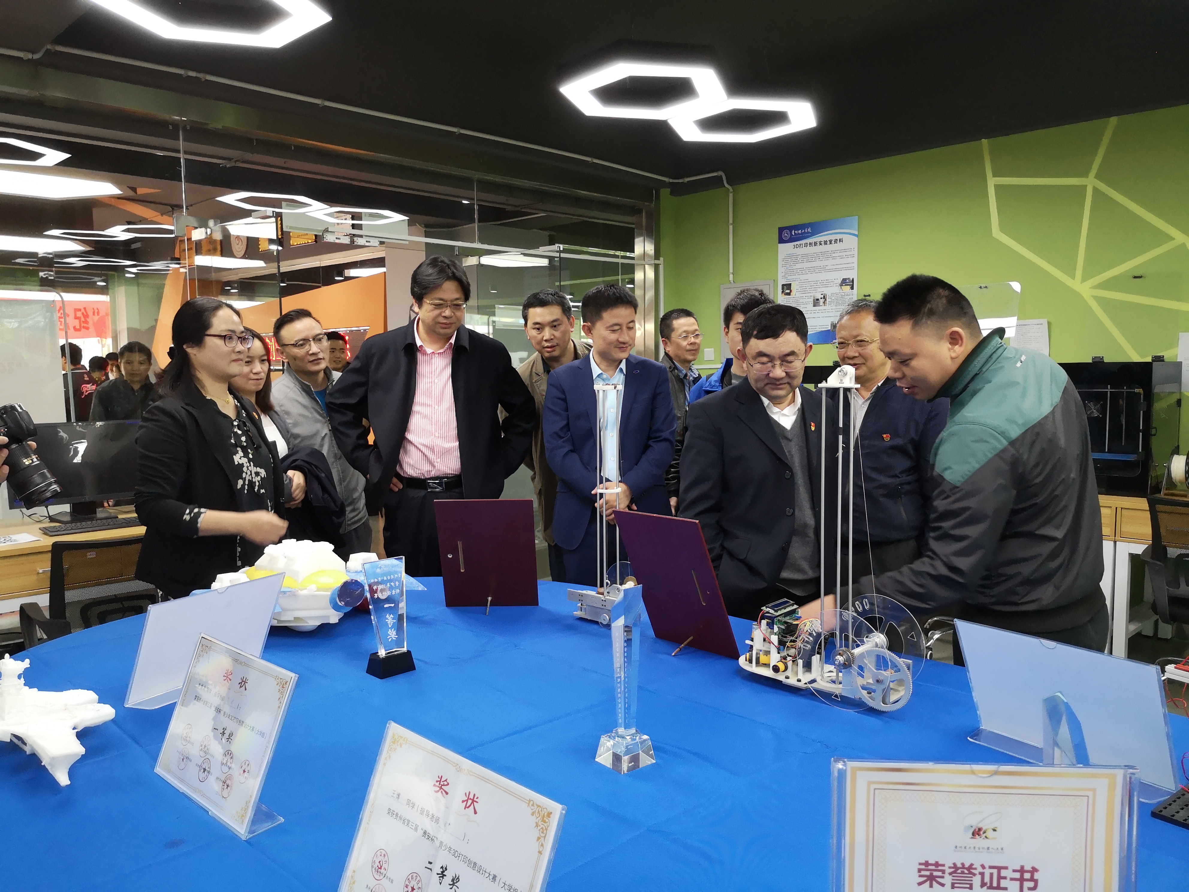 2019年5月9日,“纪念五四运动100周年”贵州理工学院首届大学生创新创业成果展开幕式暨“互联网+”创新创业大赛“青年红色筑梦之旅”启动仪式在创新创业中心开展。工程训练中心(以下简称中心)3D打印创新实验室作为本次成果展的重要展点,集中展出了一批中心教师近年来指导学生获得的创新创业成果奖项和作品。中心展出的作品受到学校领导、各学院教师和学生的广泛关注,校领导亲临展台并仔细观摩学生作品,在肯定学生作品的同时,也指出了作品的一些不足之处,为中心教师指导学生创新创业提出了宝贵的建议。展览当天,来自学校不同专业的部分同学积极与中心教师交流,展览获得了圆满成功。