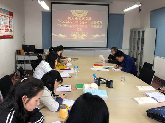 2019年11月8日,机关党委第七支部在工程训练中心会议室组织党员同志开展了“不忘初心、牢记使命”主题教育“对照党章党规找差距”专题会议,学校主题办第五巡回指导组组长段筑生同志参加会议,会议由六部分组成:(一)钟晓峰同志领学《习近平总书记在中央政治局第十五次集体学习时的讲话——牢记初心使命,推进自我革命》;(二)卢燕同志领学《中国共产党章程》;(三)杨瑾羽同志领学《中国足球彩票新形势下党内政治生活的若干准则》(四)钟晓峰同志代表机关第七党支部作党支部班子对照党章党规找差距剖析发言;(五)支部党员依次对照党章党规找差距,其他同志对发言同志提意见建议;(六)钟晓峰同志作总结发言。