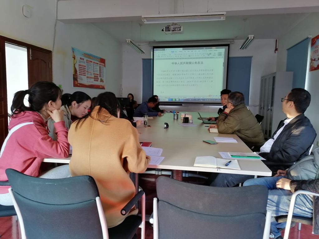 此次会议主要内容有:高主任组织全体教师学习《中华人民共和国公务员法》知识,并在学习后组织老师们交流学习后的感受。
