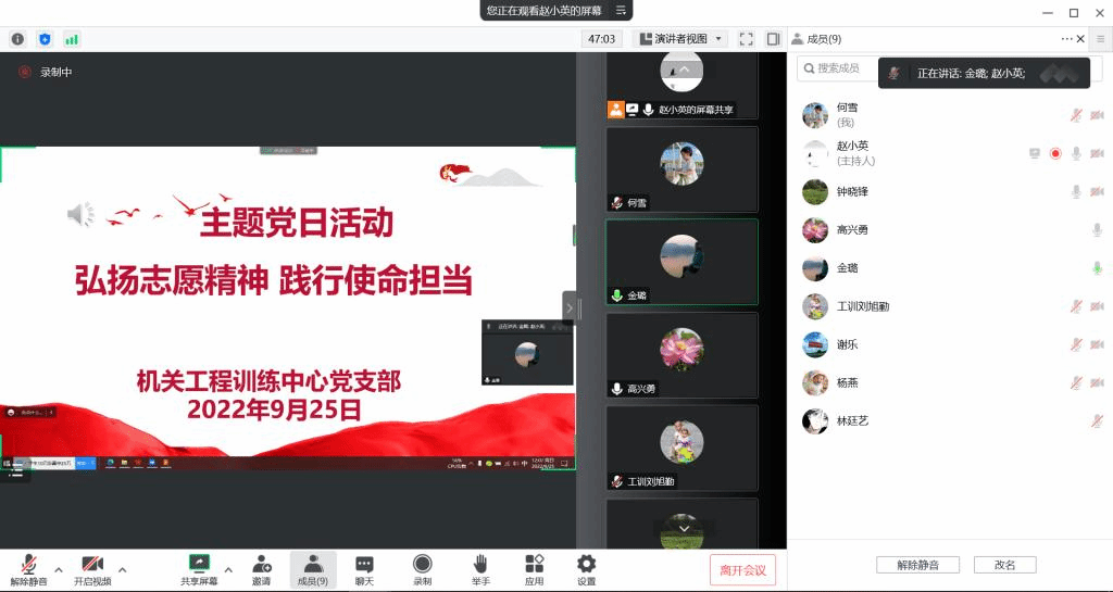 机关工程训练中心党支部于9月25日11:00通过腾讯会议组织召开“弘扬志愿精神 践行使命担当”主题党日活动。