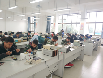 电子工艺训练室位于工程训练中心综合训练大楼三楼,面积:150 m?。其主要设备情况:实训台(36张);函数发生器(40台);示波器(40台);可调直流电源(40台)。实训室可作为集成电路板的检修、调试实验台,也可作为电子产品安装与调试操作台。通过电子工艺实训,让学生掌握电气仪器仪表的使用、常用电子元器件的识别和使用、普通电路设计能力,同时具备一定焊接技术。电式工艺实训,注重学生实践能力、独立获得知识能力和提出、分析、解决实际问题能力的培养,加强工艺教育,为学生建立工艺基础平台,使学生获得现代电子工业的基础知识。主要开设实验项目:1. 安全知识及操作规范、元器件基础知识实训;2. 电子元器件识别、检测方法实训;3. 焊接练习实训;4. 小型电子产品的制作、电路的焊接、安装;5. 小型电子产品的制作、电路的调试。