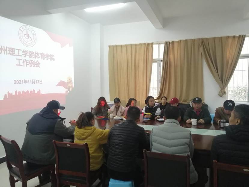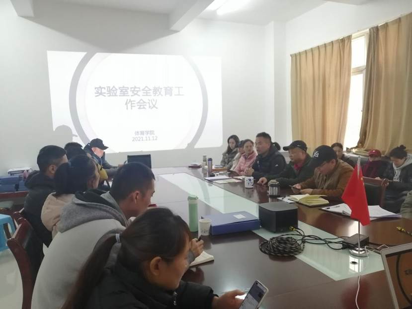 2021年11月12日上午,体育学院在学院会议室召开了工作例会,体育学院院长高徐、党总支副书记王凯、副院长刘世多及全体教师参加会议,会议由王凯主持。会议共分为三项:一是2022年度国家社会科学基金项目申报动员;二是实验室安全教育工作会议;三是传达学校绩效工资分配考核分配方案。