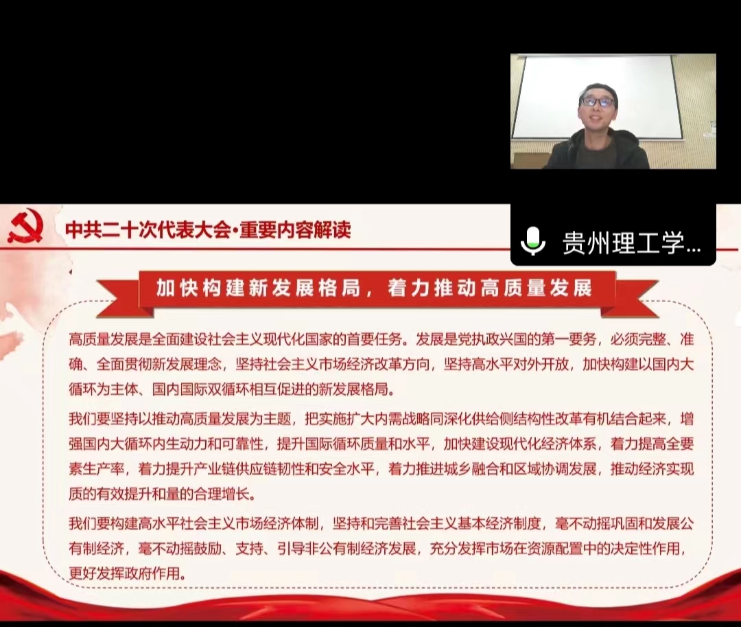 2022年12月11日,体育学院通过线上线下相结合的方式,组织学院学生党员、入党积极分子及学生干部开展深入学习贯彻二十大精神专题学习活动。此次活动主题为“踔厉奋发、毅勇前行,做有理想、有担当、能吃苦、肯奋斗的新时代好青年”,由贵州师范大学体育学院党委副书记彭佐扬主讲。体育学院党总支副书记王凯,学生科副科长杨骐璟参加此次专题活动。