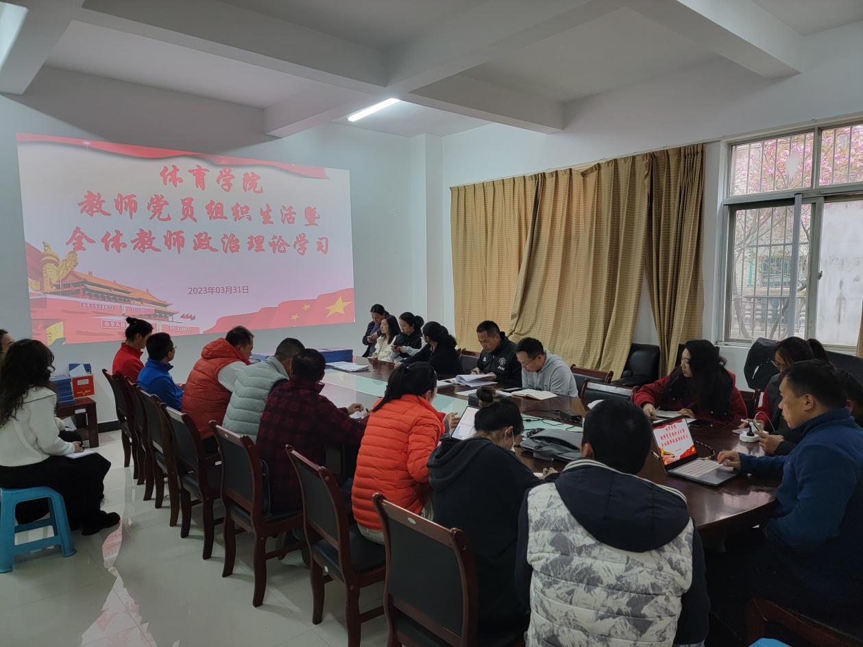 2023年3月31日上午,体育学院在会议室组织召开工作例会,学院全体教职工参加会议,会议传达学习贯彻中共中央政治局会议精神,研究部署学习贯彻习近平新时代中国特色社会主义思想主题教育工作,学院党总支副书记王凯主持会议。