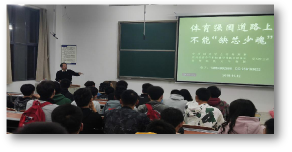 2019年11月12日晚,体育学院全体学生在开物楼1107教室参加贵州民族大学夏五四教授《体育强国道路上不能“缺芯少魂”》为主题的学术讲座。
