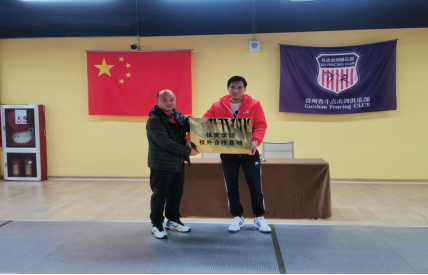 贵州理工学院体育学院高徐院长向贵州斗点击剑俱乐部授予“贵州理工学院体育学院校外合作基地”牌匾