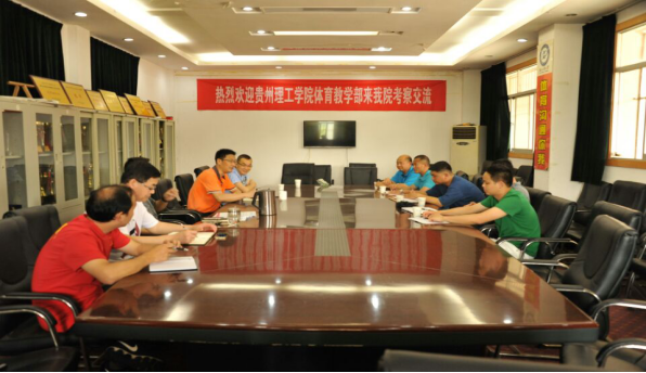 (体教部田广)2018年5月15日下午,贵州理工学院体育教学部党政领导班子成员高徐部长、任永开书记一行率队前往湖北工业大学体育学院考察本科合格评估相关事宜。湖北工业大学体育学院院长兼总支书记代永胜、副院长徐宣、张军平,教学教研室主任曾伟,办公室主任徐向东在体育学院办公室接待了我部考察团。会议伊始,体育教学部部长高徐表明此行目的,以及本科合格评估中涉及体育教学部门的几项指标,并简要介绍我部的基本情况及体育特色;代永胜院长向我部人员详细介绍了体育学院近年来的发展情况,特别是亮点领域的发展和变化。徐宣副院长介绍该校的教学基本情况,并针对我部提出的本科合格评估、迎评重难点、师资队伍建设、课程建设与质量管理、教学常规的规范与归档等问题进行了详细解答。张军平副院长对该校群体竞赛、高水平运动队、大学生体质测试、阳光体育运动等工作进行了重点说明,并就体测合格率、职称晋升、二级学院运动会等问题进行了介绍。