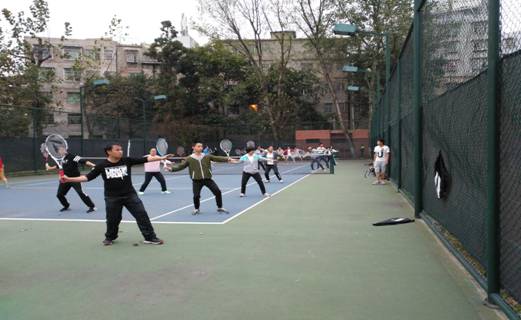 这里有一支由陶光明、任兴旺、杨元友、龙世波、陈德永等大三学生组成的教练团队,认真为社团新成员们传授网球基本知识、网球的各种技战术以及网球步伐的要领等等。