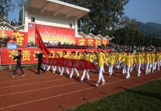放眼望去,塑胶场地上,12支方队像即将踏上征途的士兵,等待着检阅。在激进的《运动员进行曲》中,各代表队怀着坚定的信念,迈着整齐的步伐,喊着铿锵响亮的口号,依次从主席台前经过,接受全校师生领导的检阅。主席台前短暂的创意表演,向我们展示了不同学院的风格特色。校领导的勉励鼓舞、运动员、裁判员的庄严宣誓,最后由曾羽书记宣布运动会开幕,为接下来的运动竞技奏响了有力的开场音。