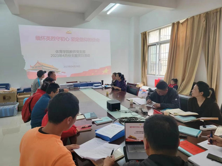 2023年4月28日下午,体育学院教师党支部于会议室开展“缅怀英烈守初心,坚定信仰担使命”主题党日活动,会议由体育学院教师党支部书记荆晓伟主持。