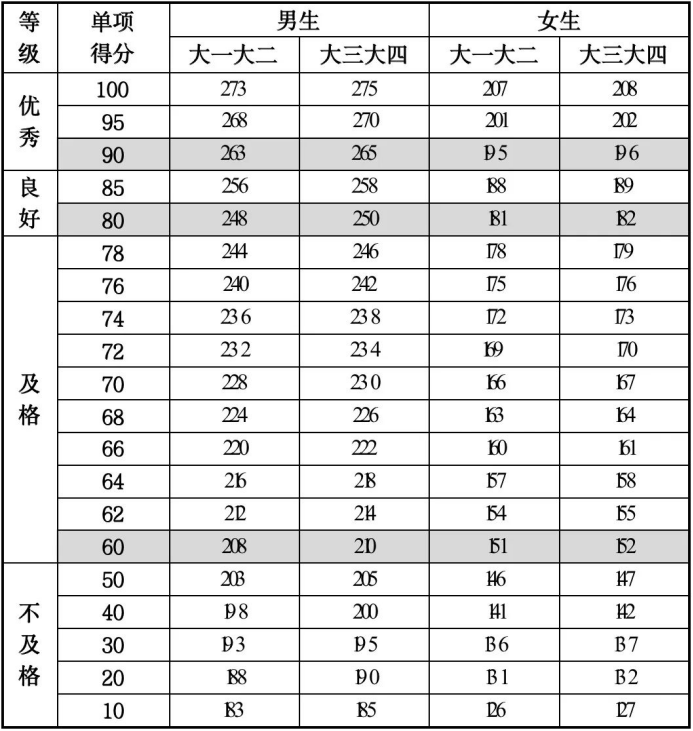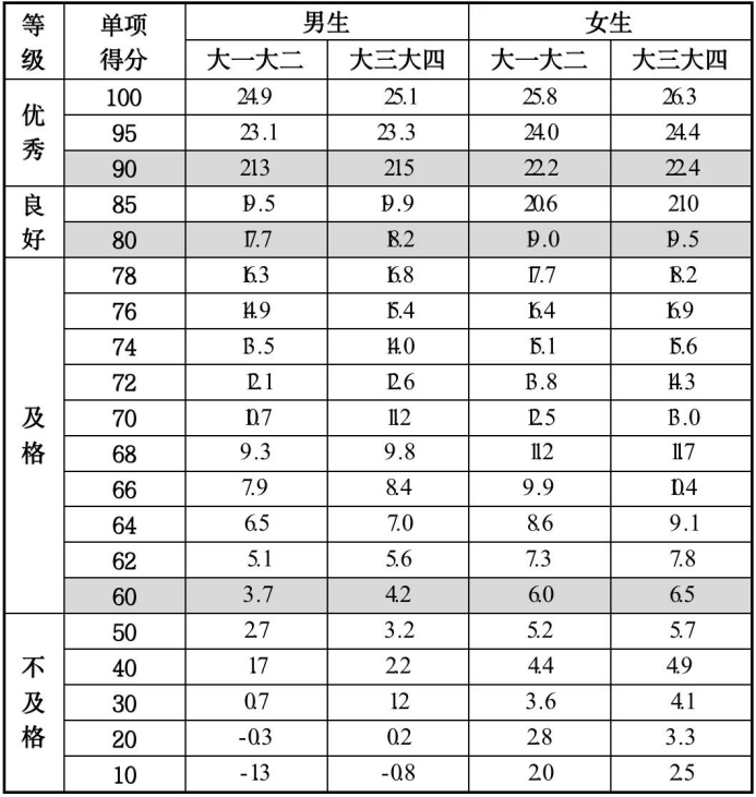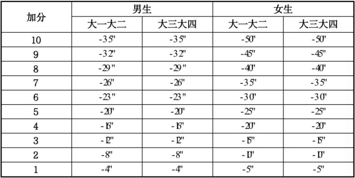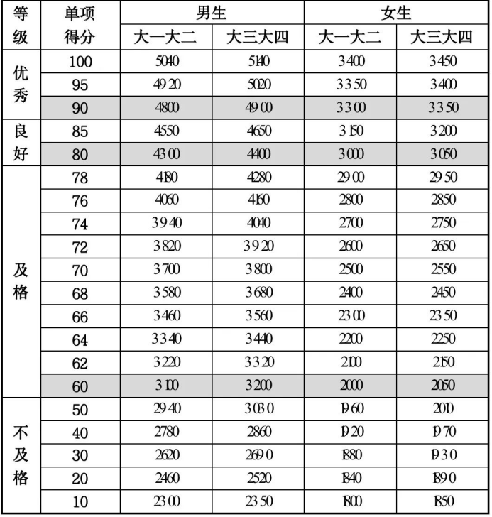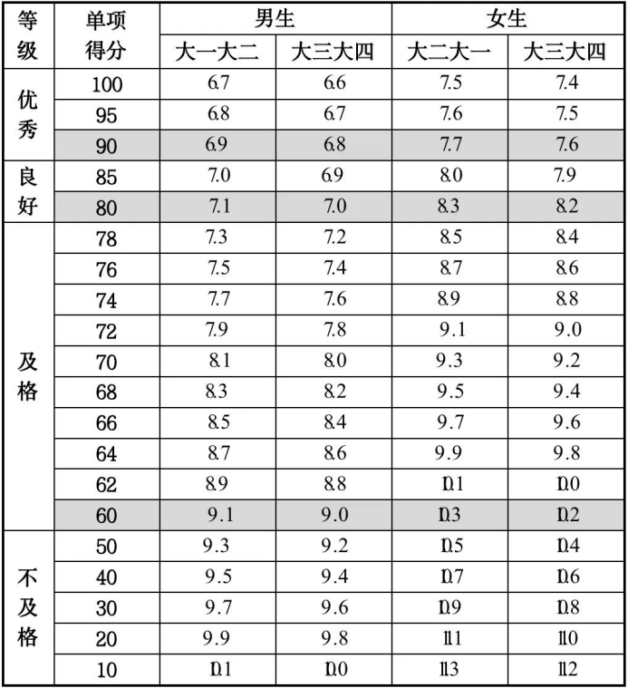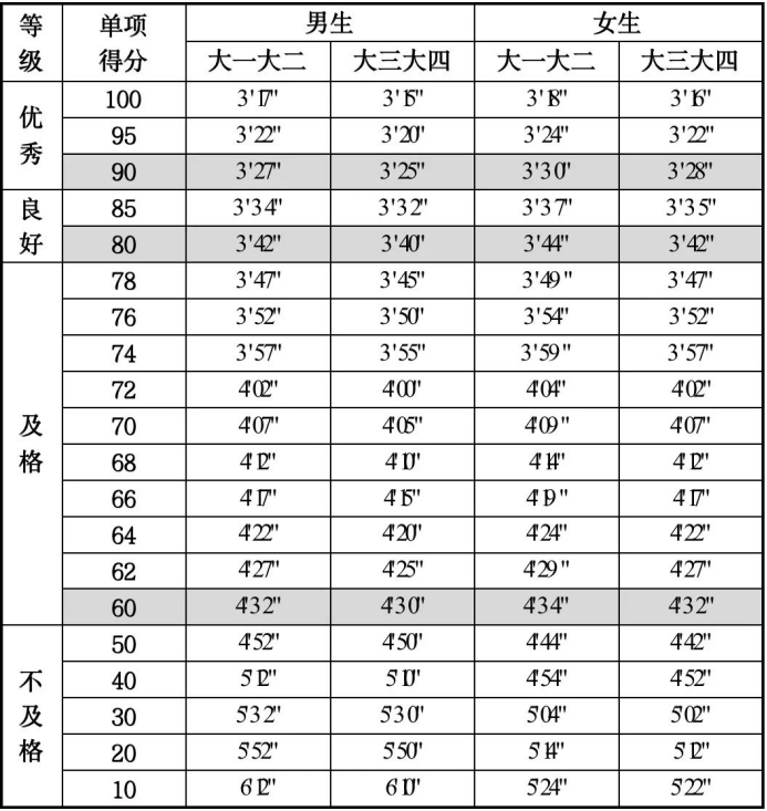 注:大学男生为1000米跑,女生为800米跑。