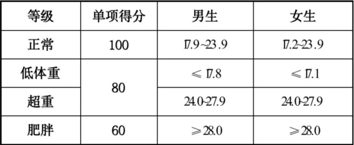 表1-1 体重指数(BMI)单项评分表(单位:千克/米2)
