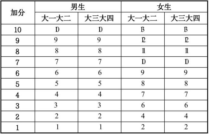 注:引体向上、一分钟仰卧起坐均为高优指标,学生成绩超过单项评分100分后,以超过的次数所对应的分数进行加分。