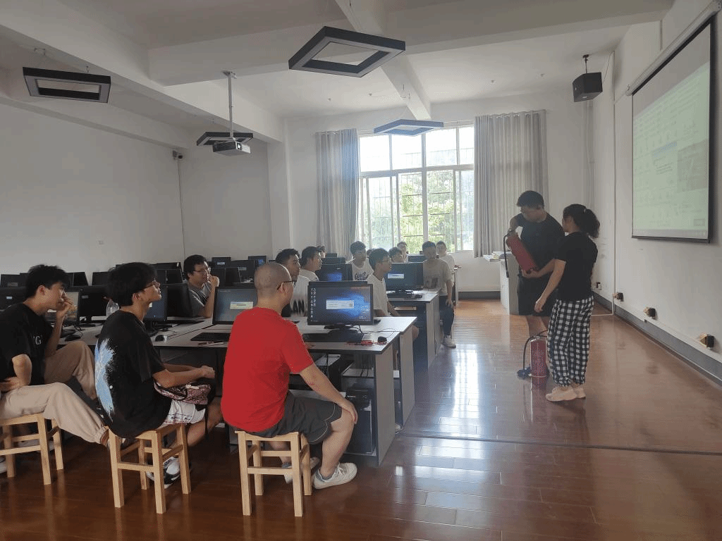 第一部分由卢云老师带领师生在虚拟实验室进行消防实操演练。重点讲解紧急疏散、初期火灾处置、逃生自救及灭火设备使用要点及日常巡查等基本知识。通过现场模拟起火,组织师生完成发生火情后的灭火及紧急疏散。