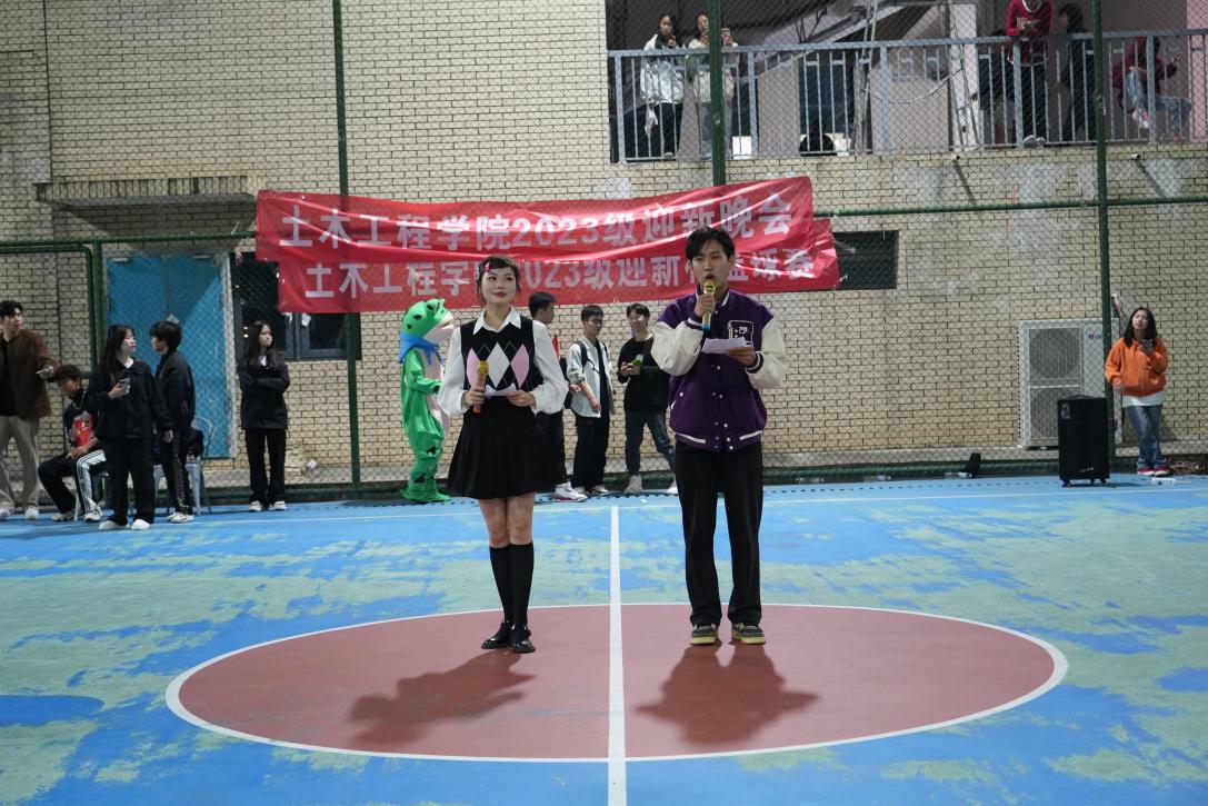 本网讯(土木工程学院 图/土木工程学院 文/龙海东)为丰富同学们的课余生活,加强同学们体育锻炼意识,提高身体素质,培养积极向上顽强拼搏的精神,11月10日晚,土木工程学院在学校篮球场举办2023级新生迎新晚会暨迎新杯篮球比赛。学院党总支副书记杨文斯、学生科负责人秦丽丽莅临现场。本次迎新晚会由土木203陈炳睿和土木231江依涵主持。