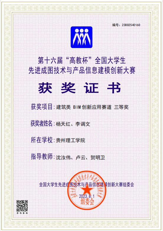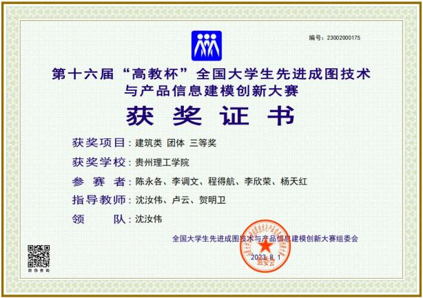 在第十六届“高教杯”全国大学生先进成图技术与产品信息建模创新大赛总决赛中。我院5名参赛学生陈永各、李调文、程得航、李欣荣、杨天红在沈汝伟、卢云、贺明卫等老师的指导下共获得了团体三等奖1项(建筑类)、个人三等奖1项(建筑类)、BIM创新应用三等奖1项(建筑类)。