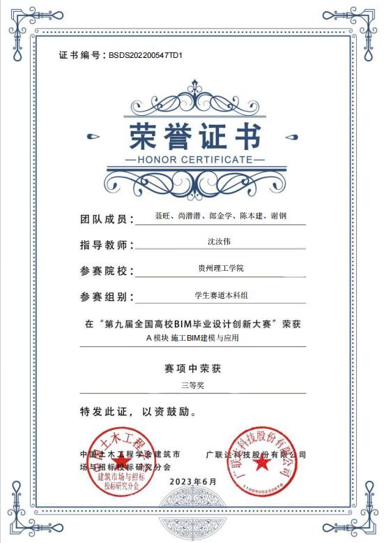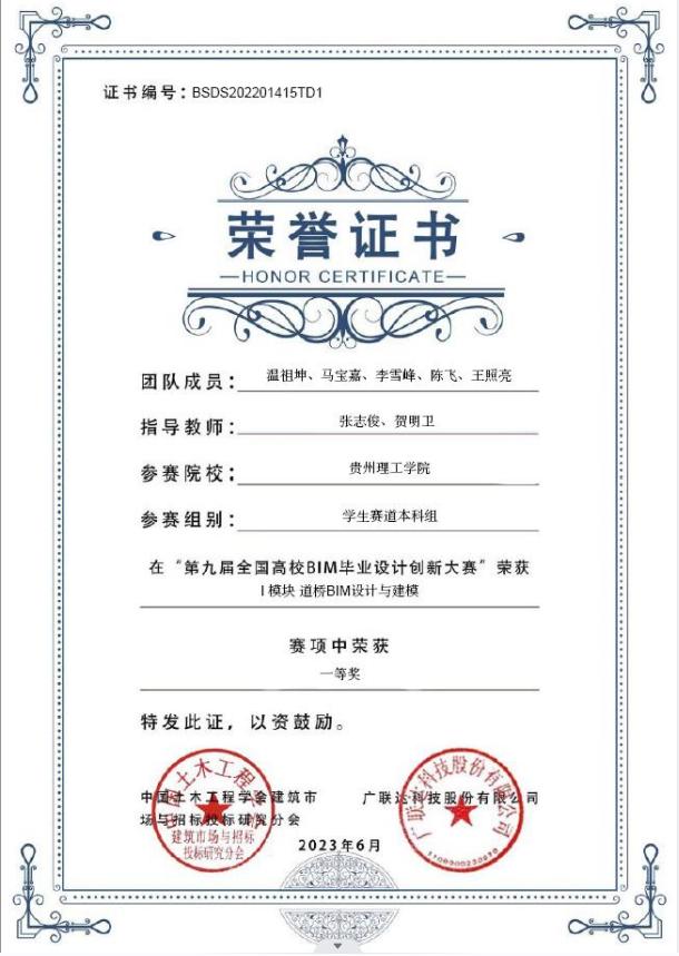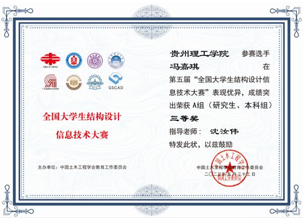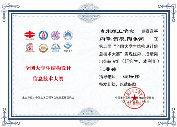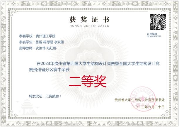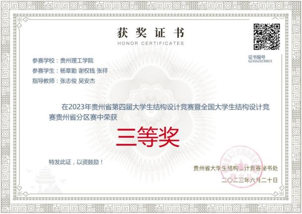 图6 全国大学生结构设计竞赛贵州省分区赛获奖证书